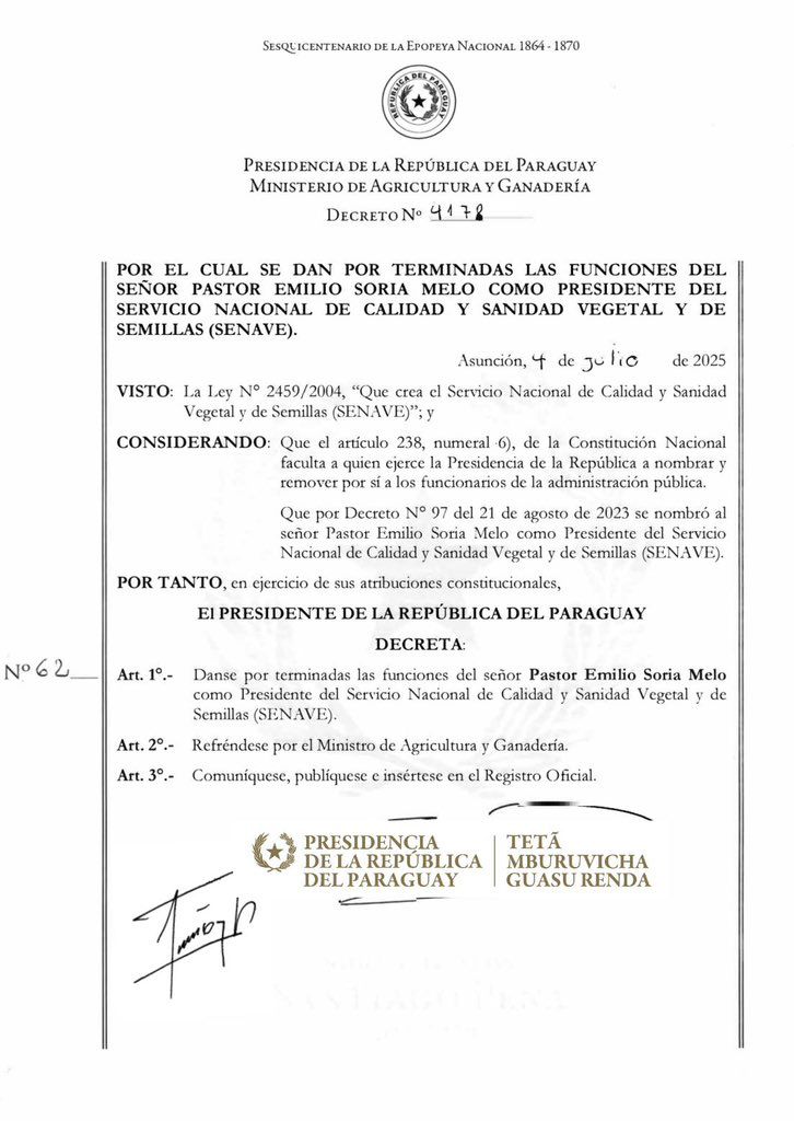 El presidente de la República, Santiago Peña, dio por terminada las funciones del titular del Servicio Nacional de Calidad y Sanidad Vegetal y de Semillas (Senave), Pastor Soria, tras la imputación del Ministerio Público que lo involucra en un esquema de cobro ilegal de coimas a importadores frutihortícolas.