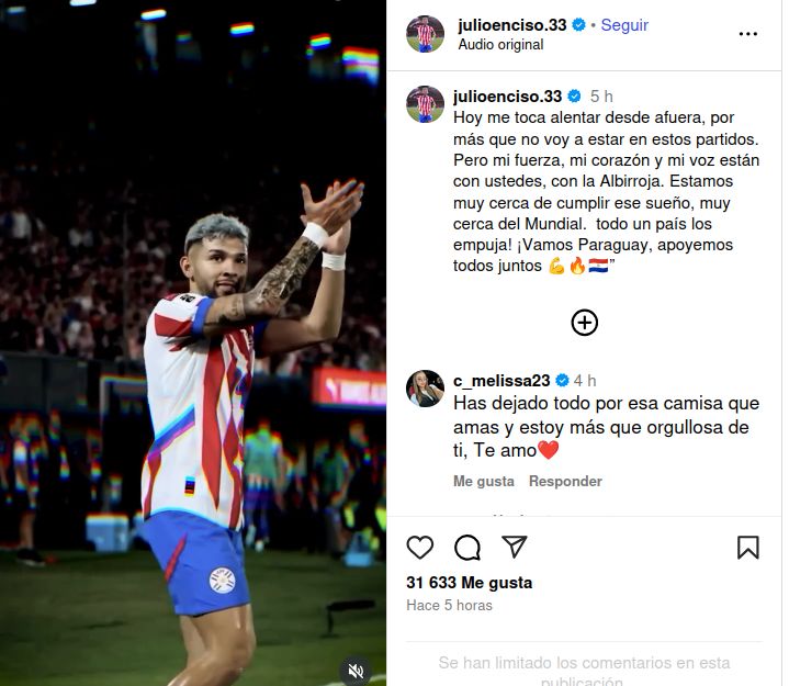 “Hoy me toca alentar desde afuera, por más que no voy a estar en estos partidos. Pero mi fuerza, mi corazón y mi voz están con ustedes, con la Albirroja. Estamos muy cerca de cumplir ese sueño, muy cerca del Mundial. todo un país los empuja! ¡Vamos Paraguay, apoyemos todos juntos!” escribió el atacante.