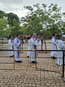 CAACUPÉ. La jornada de hoy en Caacupé empezó con una peregrinación desde el Tupãsy Ykua, encabezada por obispos y sacerdotes, dando inicio a la misa del cuarto día de la novena en honor a la Virgencita Azul.